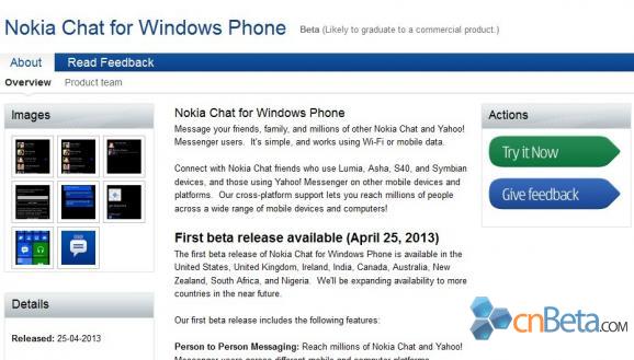 今天诺基亚在Beta Labs测试软件实验室博客宣布为旗下的Lumia系列Windows Phone手机推出一款新的实验性应用,名为Nokia Chat for Windows Phone(诺基亚聊天)。这是一款暂时仅限部分诺基亚机型的应用,将使用Lumia、Asha、S40、Symbian设备以及在其他移动设备与平台使用Yahoo!Messenger的用户联结到一起。