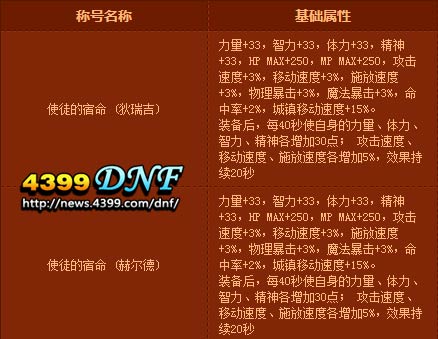 称号属性(只截图两个)查看全部[使徒称号]属性 点击DNF2013五一礼包称号 使徒称号属性一览