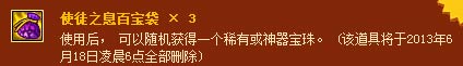 使用后, 可以随机获得1个[使徒的宿命]称号 (希洛克或罗斯特中的一种)。该道具将于2013年6月18日凌晨6点全部删除。