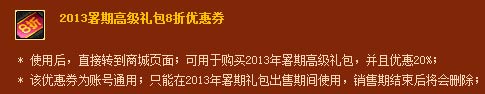 赠礼(装备品级调整箱×10、闪亮的雷米援助×100、复活币×20、遗迹探险资格证×20、异界气息净化书×1、闪亮的魔力果汁×100、战魔之吼秘药×50、祝福强化券 (+9~11)×1、2013暑期高级礼包8折优惠券)