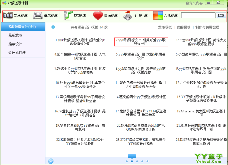 我这里依次选择:k歌频道设计(设计模板分类) - yyk歌频道设计图- 甜美可爱k歌频道专用(具体设计模板);