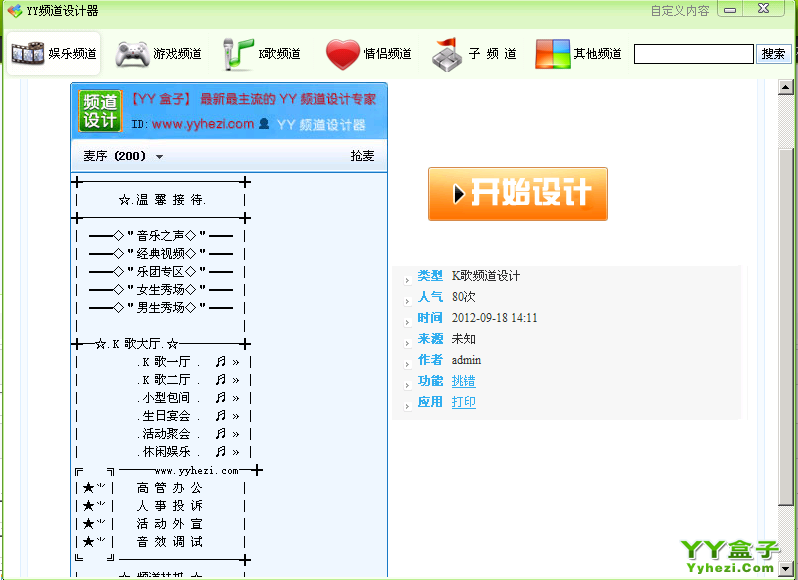 第二步:选定需要设计的频道模板,这里分类有:娱乐频道设计,游戏频道设计,K歌频道设计,情侣频道设计,子频道设计,其他频道设计;这里根据自己的频道需求选择需要设计的频道模板;