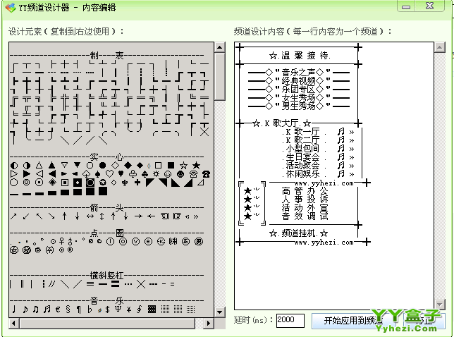 传统的yy频道设计是比较死板的,需要一步一步复制黏贴,这样设计不仅耗时比较久,而且复制还容易出错;那歪歪盒子正是因为这点,所有才推出这个功能;国内首家频道设计,让一键设计yy频道不再是梦;让漂亮的频道设计图更加多了!好了,下面小编就开始介绍yy频道设计器的使用了!