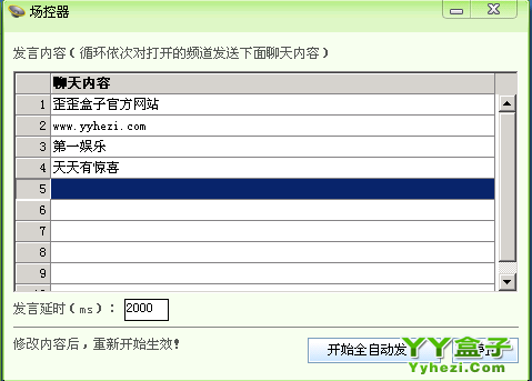 第二步:打开场控器的主界面即可进入场控设置! 之后设置好时间等待,计时单位是ms(毫秒)。默认是2000毫秒=1秒;之后添加自动发言的内容;如图:
