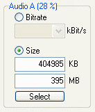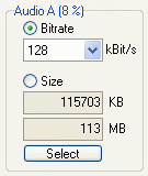 ▲如果AVI最终想采用MP3音轨(制作1CD),就参照左图:选定一个粗略估计的码率供GK计算用,一般选128Kb/s,最终的mp3文件大小要在后面的音频编码之后才能得到;