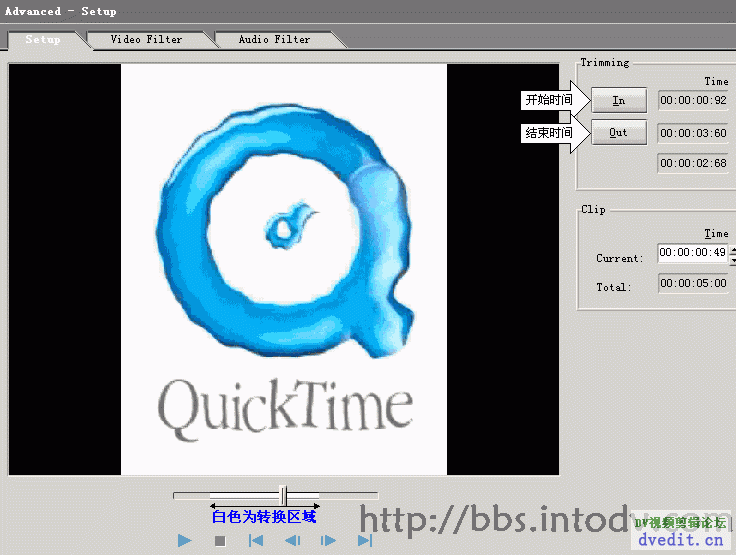点右面的“In”按钮,设定开始时间,“Out”设定结束时间