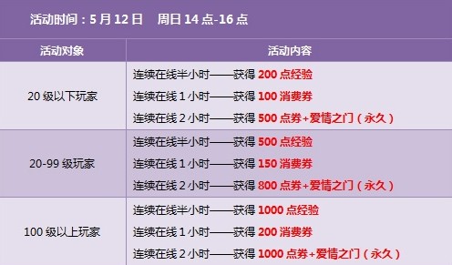 5月12日 周日14点到16点玩家连续在线2小时就能获得相应的姜堰,点券和消费券奖励,还有爱情之门(永久)。