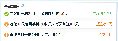 3)连续10天登录使用手机QQ与好友聊天,每天可以加速0.3天。加速算法是满足条件后第10天额外一次性的送3个活跃天,以后每天送0.3天。小编提醒大家:想要QQ快速升级,一定要连续登陆手Q,记得不能间断哟!