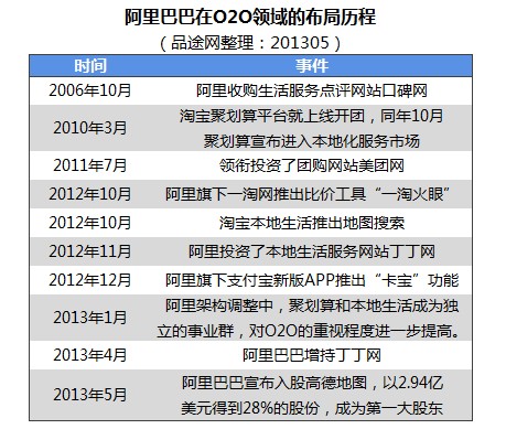 阿里集团于2006年收购口碑网,开始布局本地生活服务O2O领域。2010年3月淘宝聚划算平台上线开团,同年10月聚划算宣布进入本地化服务市场。2011年后,阿里集团逐步把口碑网并入淘宝本地生活,并在2011年7月领衔投资了团购领先企业美团网。2012年,阿里集团确定了“生活在淘宝,购物在天猫”的战略,2012年7月阿里集团进行了架构调整,聚划算升级为事业群,加大引进独立团购网站的力度;10月,淘宝本地生活推出地图搜,弥补其在地图方面的弱势地位;11月,阿里集团宣布战略投资丁丁网,增强其线下能力。