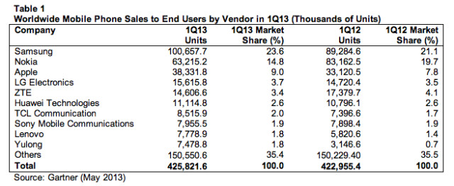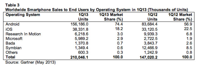 市场研究机构Gartner刚刚发布了2013年第一季度的移动设备研究报告,和预期的一样Android主要以三星为代表控制着全球最大的市场。第一季度的移动设备销量相较去年同期仅上涨0.7%达到4.25亿台。其中智能手机销量提升6300万台,成绩仍然非常不错。