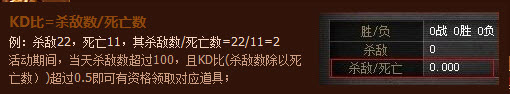 活动期间,在非挑战模式下,当天杀敌数超过100,且KD比(杀敌数与死亡数的比值)超过0.5即可有资格领取对应道具。