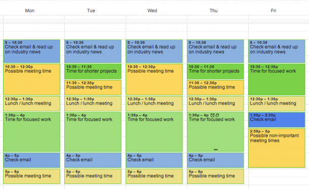 以上几点是你在进行时间规划时必须考虑的因素。依自己的工作时间绘制时间表格,将无法协调时间的活动(比如例会、午饭)填入表格,优先安排需要在特定时间完成的工作,之后再根据自己的情况将表格的每一块空白填满。把工作安排在效率最高的时间段,低效的时间安排给联络交际或是阅读行业新闻,诸如此类等等,以下是一张样表: