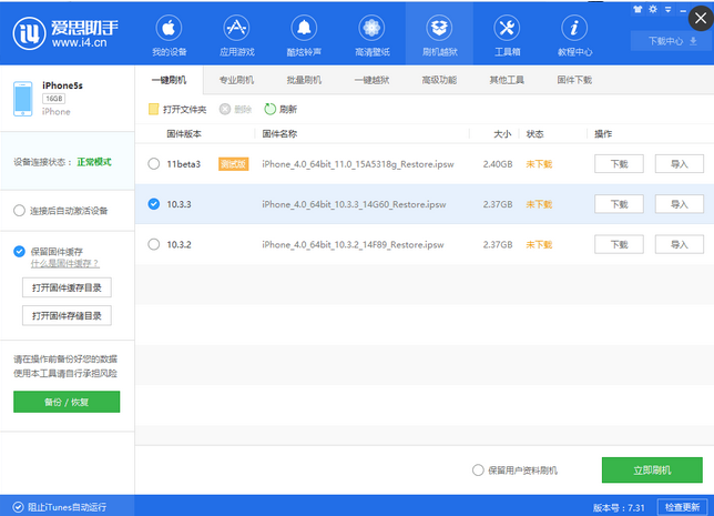 2、在可刷版本中选择您要刷的 iOS 版本,点“立即刷机”,之后爱思助手会自动帮您下载固件并刷机;