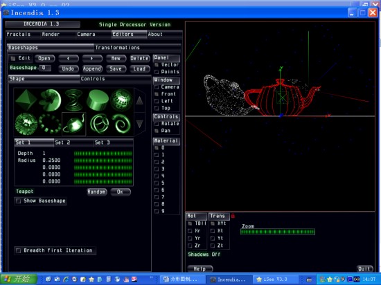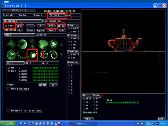 1. 启动incendia软件。在右边你将看到一幅三角形的分形图。请你按顺序点击editors/edit/new/茶壶图形。