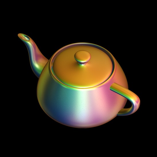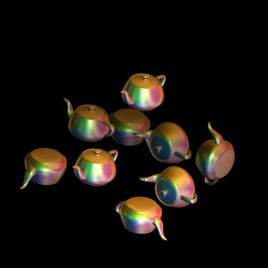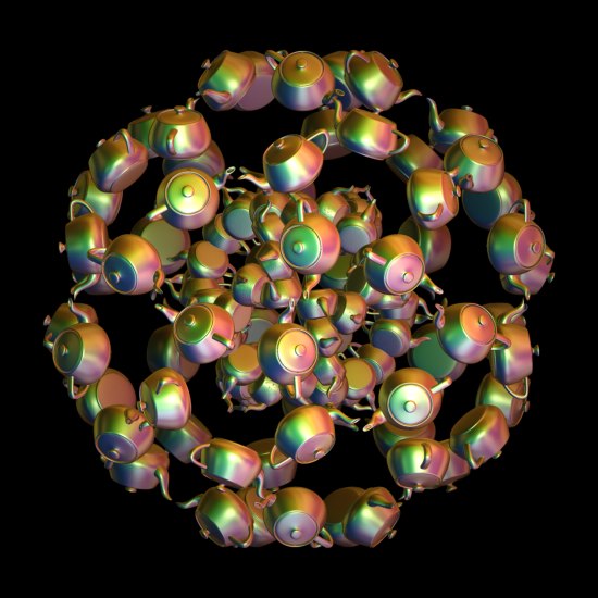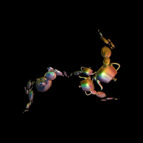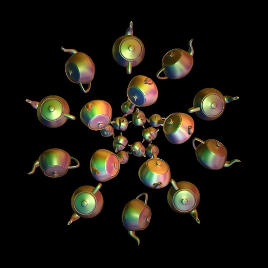 哇!舞台上出现多把茶壶。你不停的点击舞台下面的<newfractal> 舞台上的茶壶数量和形态会一直的变化。数量最少是2.最多是9.我选了一张渲染成图片:
