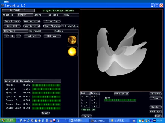 把Resolution改为1024x1024/change,再点下面symmetry中的sphere..再点开Render渲染界面。在午台下面随意点一下newfractal产生一个白色的物件图形。