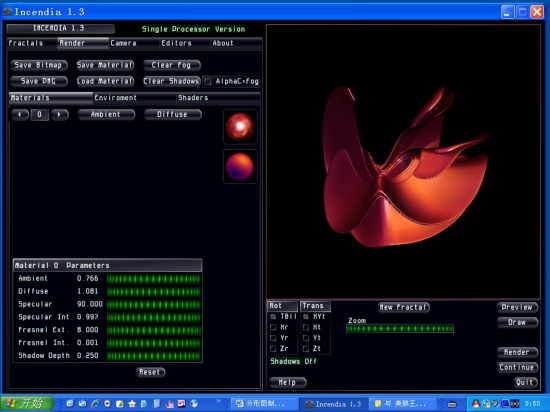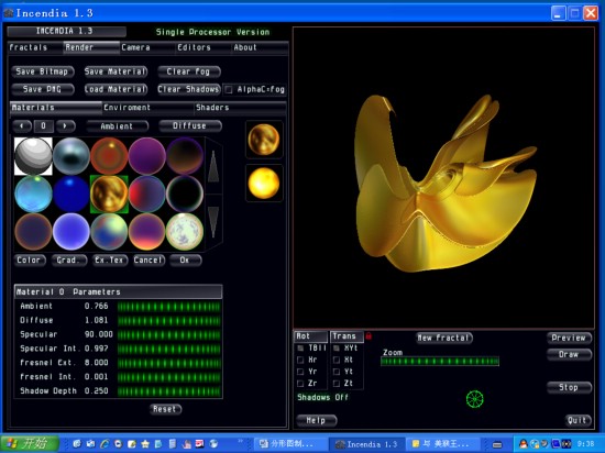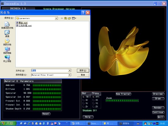 除了存出图片之外。你还可以把物件连同彩色作为源文件存下来。在fractals界面点Save parameters就可以把源文件存出来。源文件的好处是文件很小(只有5K),但是你下次载入要得到图片。还需要渲染一次才行。
