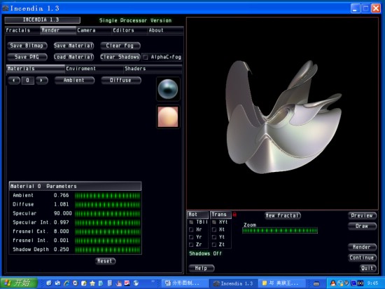 点开fractals面板、选择fractal type/18Gumowski-miraAttractor点开Editors面板。点Edit/new.在左侧的shape 中选球形点一下。这时的baseshape号为0,中部的material号也为0,把下面set1中的Depth值调为4.(用鼠标在后面的横条上拉动),再点开Camera面板。