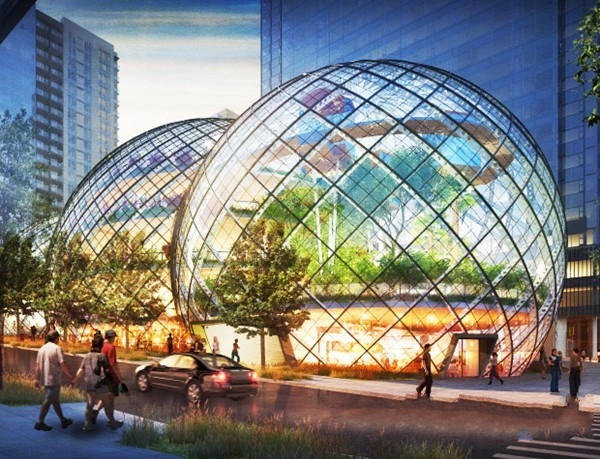 早在 2012 年秋天,知名建筑设计公司 NBBJ 就已经公布了亚马逊西雅图总部的建筑计划图,但 NBBJ 于日前宣布,在原有建筑图纸上进行改动,新增了 3 座颇为引人注目的球型透明建筑物。据悉,这 3 座球体建筑实则是 3 个“生物圈',将会在里面种植来自世界各地的植物,旨在为亚马逊员工提供一个公园一般的工作环境。