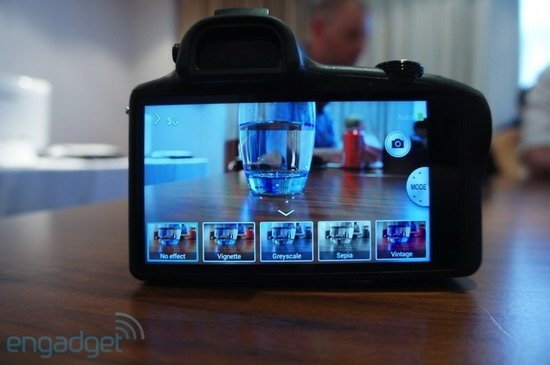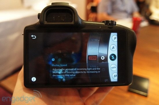 至于拍摄界面,三星Galaxy NX基本上与之前的Galaxy Camera保持一致,通过屏幕右侧的模拟镜头环界面可以更改拍摄模式,包括常见的PASM,也拥有用户自定义模式。另外,也拥有多种特殊滤镜效果,会并排出现在界面下方,操作起来与智能手机十分相似。除了使用屏幕取景,三星Galaxy NX还内置了800×600分辨率的电子取景器,使用取景器时屏幕会自动关闭以节省电力。如果你需要调节更多复杂的参数,可以通过物理滚轮和触摸屏相结合的方式来实现更好的操作,并且拍摄的参数设置会显示在屏幕的左上和右上方,方便用户实时查看拍摄状态。