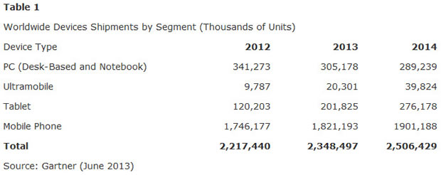 Gartner周一发布报告称,今年全球IT设备(PC、手机和平板电脑等)出货量将达到23.5亿部,而2014年将达到25亿部。Gartner称,这主要得益于智能手机和平板电脑的推动。按操作系统划分,在今年将出货的23.5亿部设备中,Android设备将占到1/3。相比之下,传统PC(台式机和笔记本)出货量将继续下滑。去年,全球传统PC出货量为3.41亿部,而今年预计为3.05亿部,2014年为2.89亿部。