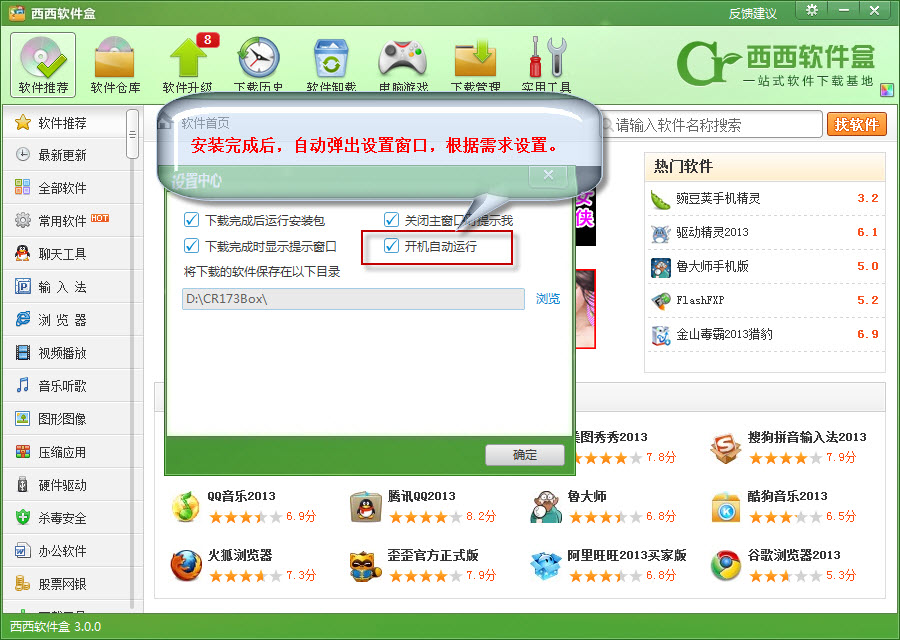 答:在安装西西软件盒的时候,请注意不要勾选"开机运行",解决方法:在西西软件盒界面右上角点击设置图标,在选项中去掉"开机自动运行"即可!