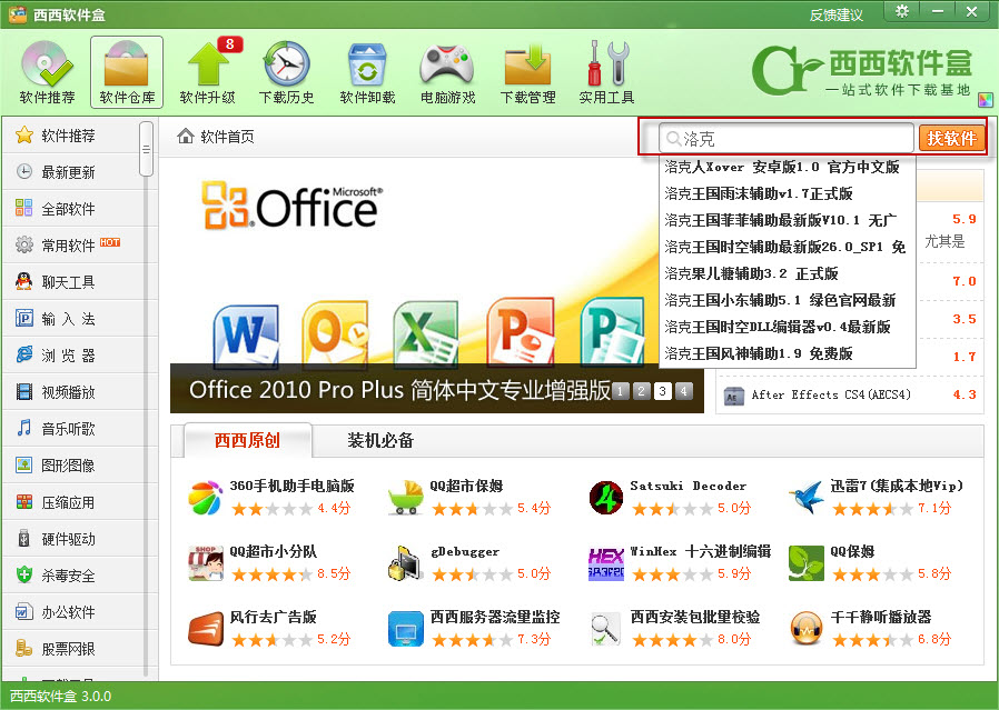 搜索框在右上角位置,关键词的输入尽量简洁。在搜索结果中,西西软件盒会优先呈现用户评价较高,使用较多的软件。