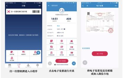 旅客通过“南航e行”小程序,只需3步即可完成电子发票的开具。乘客可在行程结束24小时后,通过“扫一扫”纸质登机牌进入“南航e行”小程序首页,点击“电子发票”进行开具;也可直接进入“南航e行”小程序,在“历史行程”中选择需要开票的行程,点击“申请开票”进入发票申请页面。