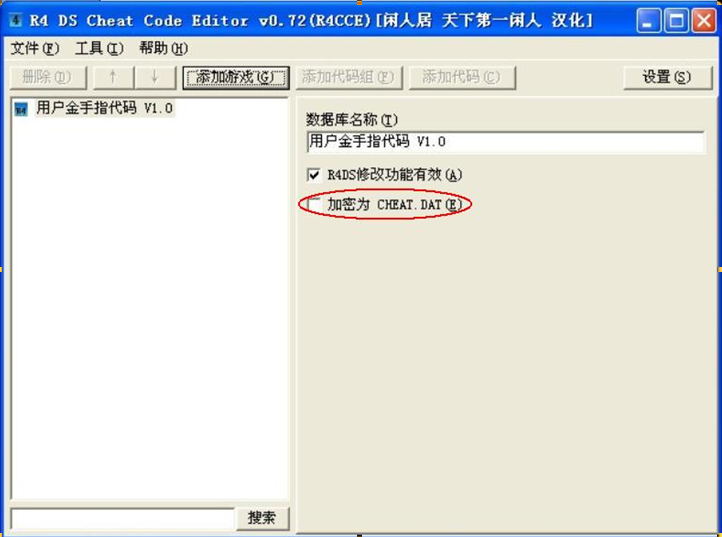 选中“加密为CHEAT.DAT”将用官方加密方式加密金手指数据库. 如下图所示: