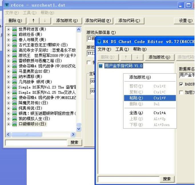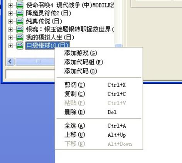 选中“游戏、代码组、代码”可进行复制,剪切,粘贴等操作,支持2个R4cce编辑器间的复制,剪切,粘贴操作(可用来合并金手指文件)。如下图所示: