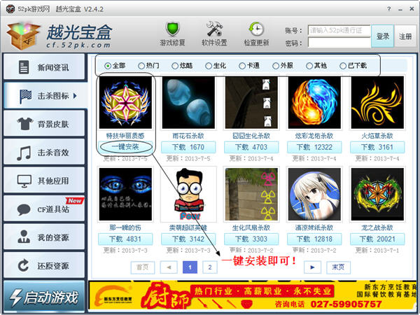 大家可以击杀图标,在右边选择你想要的图标下载,然后一键安装, 启动游戏即可!