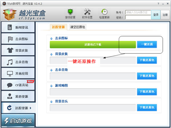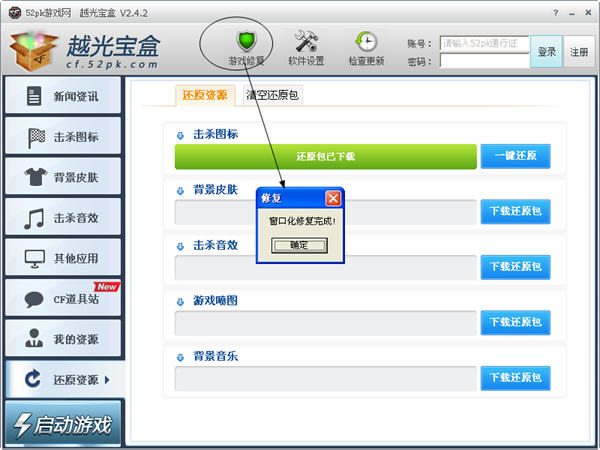 现在很多小朋友喜欢把游戏窗口化来玩,估计是为了聊QQ方便吧,不用弹出游戏。但是小朋友们却不知道怎么还原游戏,去掉游戏窗口化。那么大家只需要下个CF越光宝盒点击游戏修复即可!