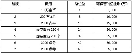 这次更新的另外一个内容就是普通仓库及账号将可以再次升级,普通仓库从原来的“华丽的金刚石仓库”升级为“泰拉石金库”需要2250点券,可以升级到最多152格的空间;账号仓库将可以升级到7阶段共48个栏位。