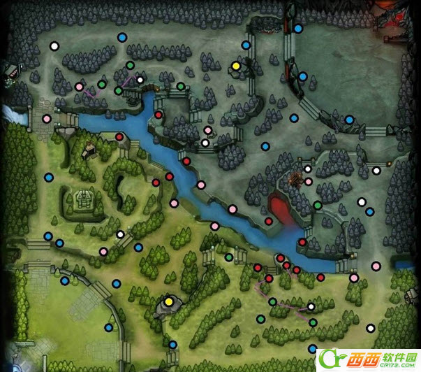 图中红色为河道眼,蓝色的都是进攻眼,黄色的是高坡眼位,粉色的是防守眼,绿色的封野和给视野。