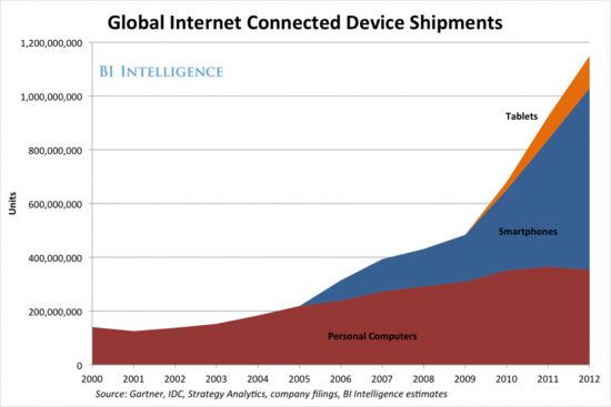 首先,看一下全球互联网设备出货统计:从2000年到2012年,虽然PC每年出货量维持在2亿台左右,但是智能手机和平板电脑出现之后,市场格局就发生了根本性变化的变化。现在PC的出货量和智能手机、平板电脑相比真可谓相形见绌。