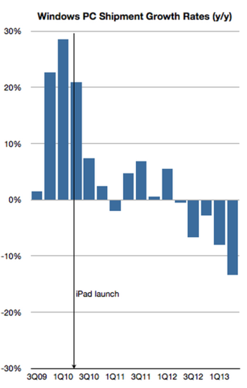 通过上图我们可以发现,在iPad发布之前,搭载Windows操作系统的PC有着相当不俗的出货增长。但从2010年底开始,PC的出货增长率一直萎靡不振,近期还出现了明显的负增长。