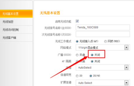 第三步:我们还可以隐藏网络“SSID”号,这样周围的其它终端设置将无法搜索到自己共享的WiFi热点,从而有效保护了WiFi热点的安全。在路由器管理界面中,切换至“无线网络”选项卡,点击“无线基本设置”项,勾选“广播SSID 关闭”项。