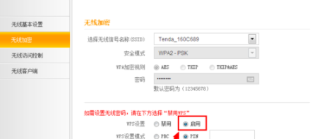 第五步:然后选择一种WPS模式,在此选择“PIN”模式,即终端需要输入所设置的PIN码才能连接。该连接方式提供可靠的加密,可以有效防止WiFi密码被破解。