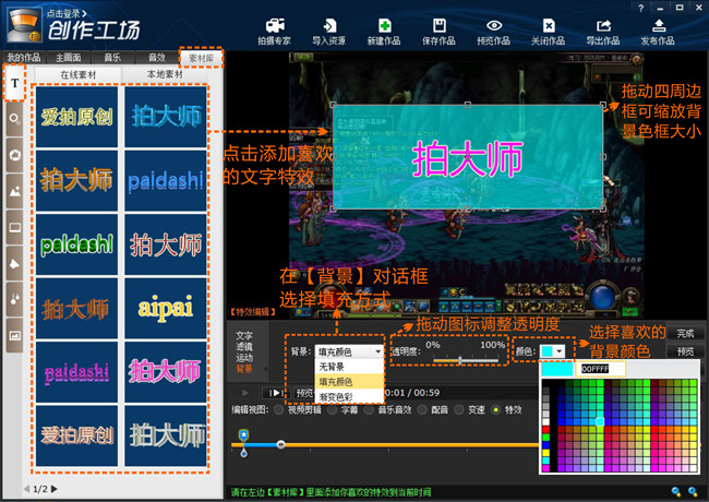 第2步:如下图1,点击【素材库】的文字【T】图标,选择添加喜欢的文字特效。在特效编辑区域点击【背景】,选择【填充颜色】,拖动中间的百分比图标调整背景颜色的透明度,点击【颜色】右边的黑色三角形符号可选择不同的背景色,拉动文字四周的背景色框可调整大小。