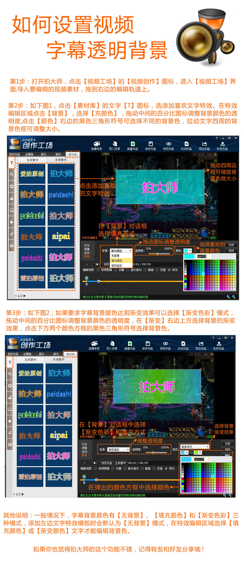用拍大师轻轻松松给视频字幕添加背景, 在很多电视节目中,我们都会看到半透明的字幕背景,这样既不会影响画面的动态效果,又可以对节目的插播内容用文字加以解释。举个简单的例子,观看快乐大本营时,观众就能经常看到在嘉宾玩游戏的画面上还会弹出半透明的的字幕来说明游戏规则。现在就和大家分享一下如何用拍大师设置视频字幕的背景色。