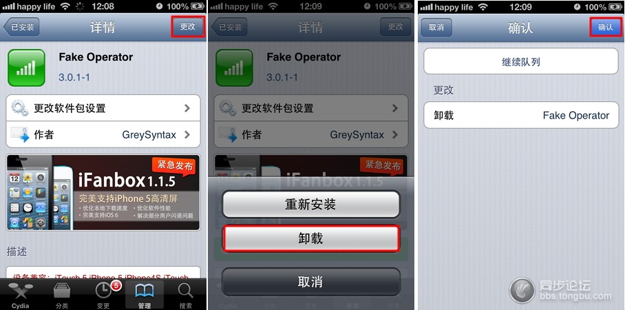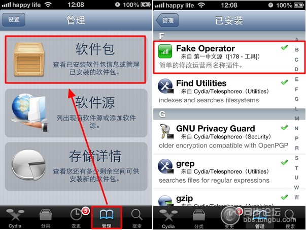 1)在手机运行cydia,进入“管理—软件包”,找到Fake operator(打钩表示已安装)