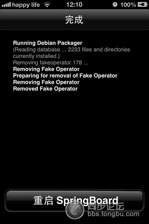 3)重启springboard后,卸载完成。然后就可以看到此前用同步助手修改过的运营商效果。