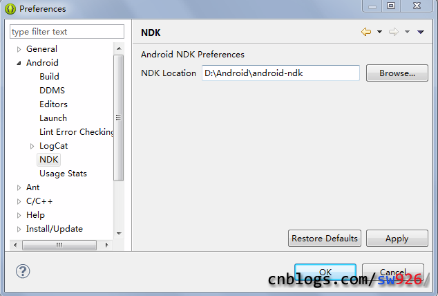 在eclipse中点击菜单栏window-Perferences,配置NDK的路径。