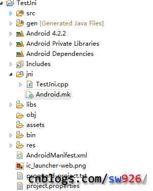 TestJni就是要加载的lib的名称,LOCAL_SRC_FILES 是资源文件的路径。