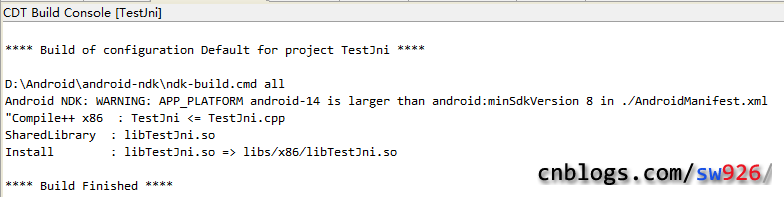 直接运行程序,可以在Console窗口中看到NDK build的输出