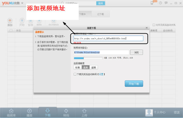 原来是用户手动添加地址批量下载的。打开优酷首页,找寻浏览地址 http://v.youku.com/v_show/id_XNTkwNDE3ODIw.html 添加,点击开始下载