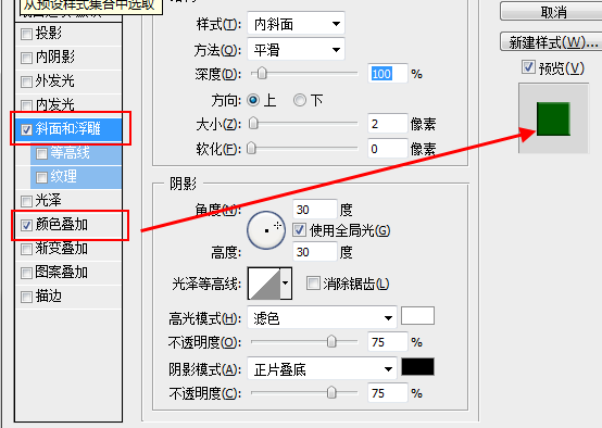 这里我们添加斜面浮雕与颜色叠加的效果,颜色添加加上自己想要做的字体颜色,这里先选择比自己要做的颜色深一些的颜色。