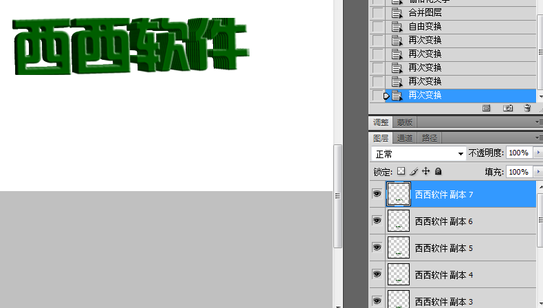 然后使用CTRL+T拉伸原图层至刚好覆盖合并后的副本图层,这样我们就做好了一个简单的立体字效果,后面再处理一下细节就好了。