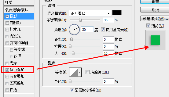 8、将原图层拖到副本图层上面,并对原图层添加图层效果,这里我们加个投影和颜色叠加,具体设置如下图。