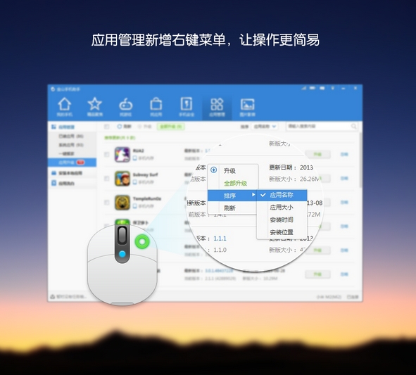 应用管理新增右键菜单,让操作更简易,已装应用、系统应用、应用升级新增右键菜单,升级、全部升级、排序、刷新鼠标右击直接选择